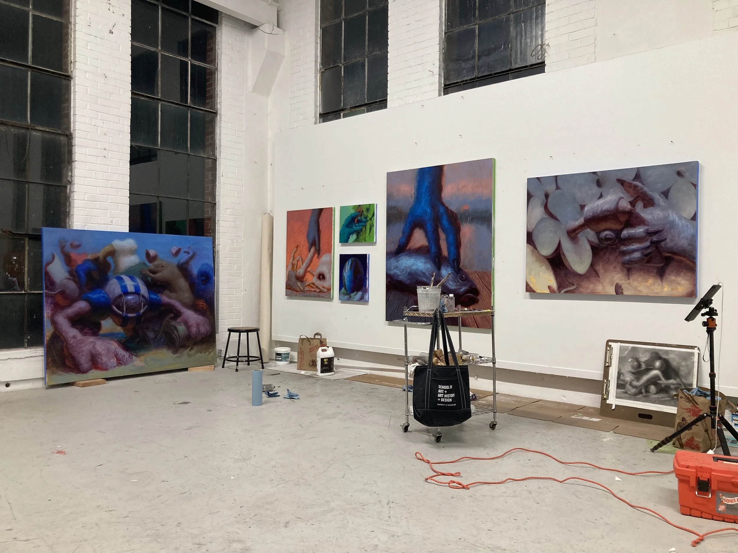 DB: Sometimes I’ll use an iPad to plan compositions. It’s really nice to be able to take a sketch and use a tool that mimics opaque paint and really play around with shapes and expand and contract the frame of the image really quickly. Sometimes I’ll use it to make some notes about color but I’m typically using physical materials to think about color. The amount of color you have at your fingertips with the iPad is kind of overwhelming when I’m trying to plan something, it scrambles my brain a little bit... I like the limitations of a physical color pallet but the iPad is a great place for me to think monochromatically and really move elements of an image around pretty instantaneously. For about a total of two seconds, I tried using AI to help me generate images of blue hands with long black finger nails doing really specific things and it turns out the one thing AI is really bad at is producing hands engaged in even the most simple gestures... So that was a very short lived attempt to use that technology to help generate imagery for paintings.