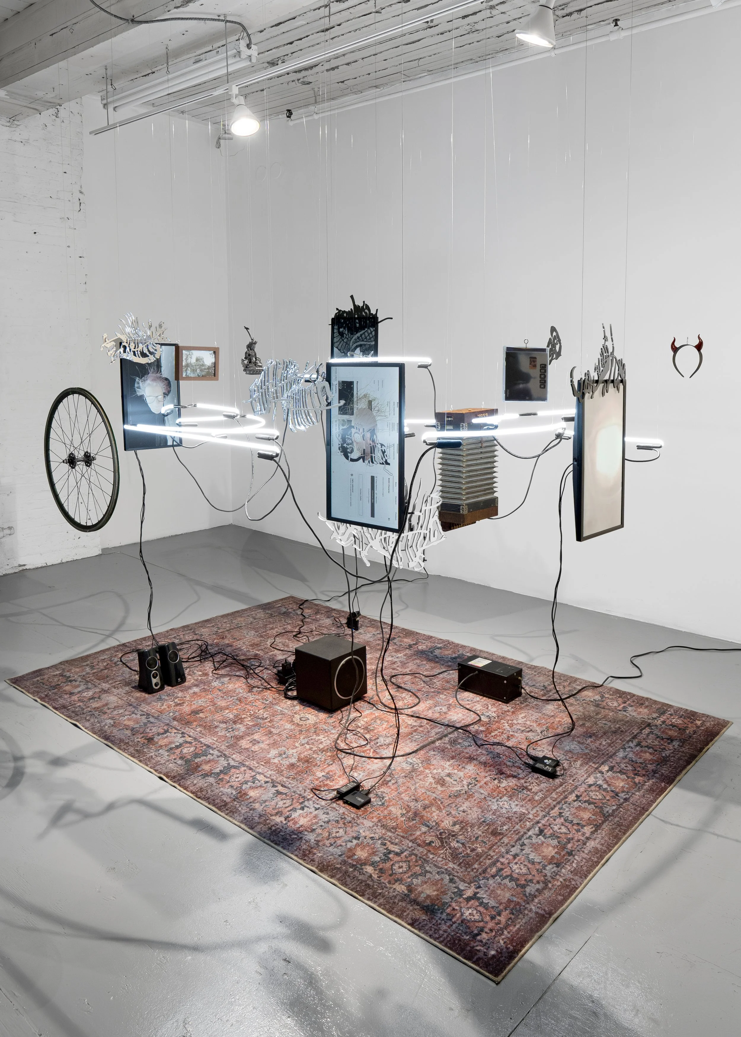Avatopology, Multi-channel 3D animations, sculptural objects, neon light, artist zine, Dimensions variable, installation view at NARS Foundation (NY), Curated by Natasha Chuk, 2024, Courtesy of the artist.