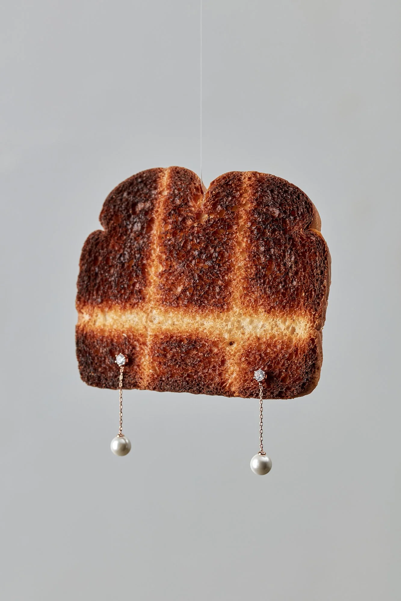 I have been finding myself returning to tan lines; cheap earrings (2022). I had been making work with pieces of sliced white bread for a few months. I challenged myself to use food as an installation material, and it came with some very weird and unstable outcomes. The whole series represents serious artistic growth for me – I loosened up my sculpture hand and stopped taking every material so seriously. Somewhere in that process, I put cheap costume earnings through a piece of toast that had such magical grill lines on it. It felt like a familiar character: a distinguished lady at the beach with overly tanned skin and jewels dripping over her one piece. There was a quickness and a wit to that piece that felt like a magic moment, where materials and humor aligned for me, even if only for a blip.