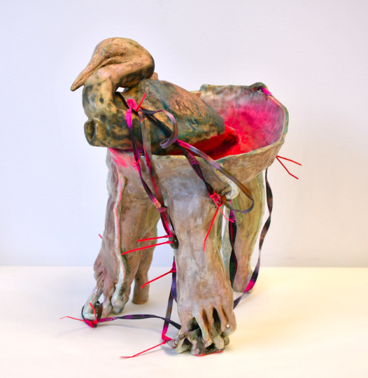 I often get interested in a particular species or relationship. I like to do a lot of research, thinking, and reading before starting a project. I also rely on collections of internet images of ancient vessels, historical artworks, various species, historical illustrations, etc. which I have organized in folders on my computer. Writing in particular is a big part of how I start a project, but I also often make very loose sketches before starting to sculpt. My sketches are always loose though, because I like to figure out the piece while building and respond to the work as I go. For ceramic pieces, I make a lot of test tiles of glazes and combinations and sometimes the works are re-fired several times. The sculptures then return to my primary studio where I incorporate other elements at times: fabric, glass, bronze or combine them with others for installation.