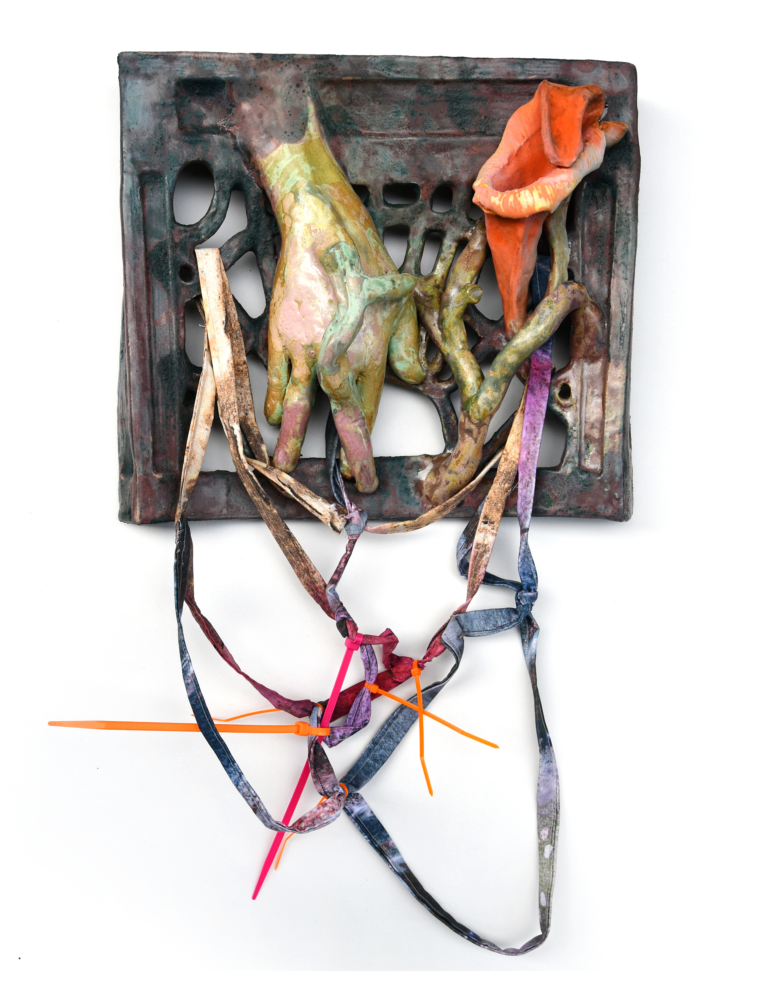 Chrysalid Interchange_ Hand and Pitcher Plant (Tropical Nepenthe), 2024, Stoneware ceramics with glazes, fabric, thread, and zipties, 21 x 12 x 4.5 in. (Private Collection)